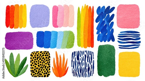 © Darunee, Fototapeta premium Abstract Handmade Collage Paper Shapes Set - Vibrant Colorful Torn Gradients, Brush Strokes, Sticker Doodles, Crumpled Textures on White Background, Icon Design Elements Collection