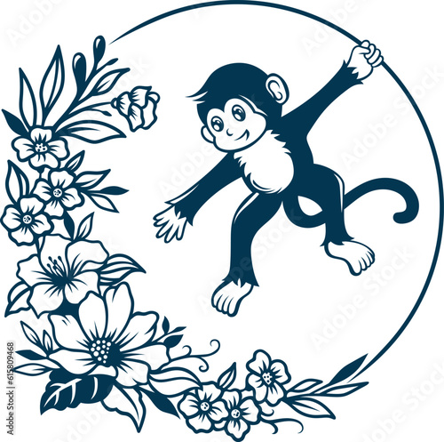 Fototapeta premium Abstract Hanging Monkey Tattoo Silhouette with Floral Accent