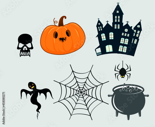 © belkas, Obraz premium Abstract Happy Halloween Holiday Vector Objects Spider with Pumpkin Bat and Ghost