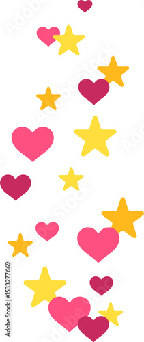 Fototapeta premium Abstract hearts and stars are floating in flat design in pink red yellow on transparent background