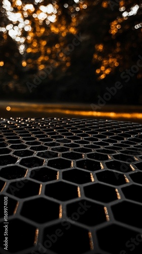 © Narongsag, Obraz premium Abstract Hexagon Pattern Dark Grid Bokeh Lights Background