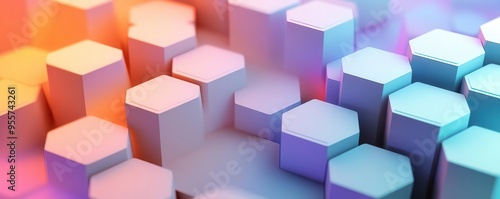 © SITTAKAN, Fototapeta premium Abstract hexagonal cascade, 3D geometric design, front view, flowing patterns, robotic tone, triadic color scheme