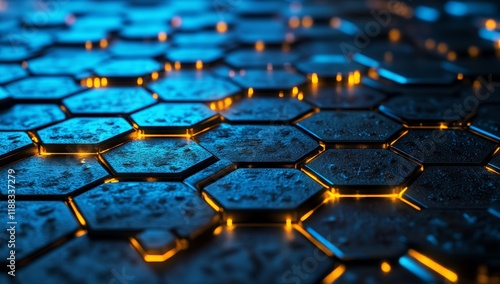 © ANZ studio, Obraz premium Abstract hexagonal dark blue metallic glowing surface.