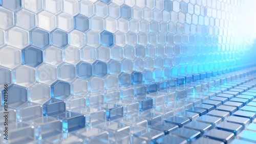© jiale, Obraz premium Abstract hexagonal grid pattern with blue lighting and reflective surfaces