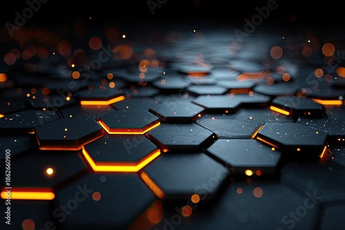 © bianka, Obraz premium Abstract hexagonal grid with glowing orange lines