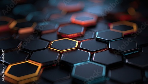 Fototapeta premium Abstract hexagonal pattern with glowing edges in dark tones and vibrant colors