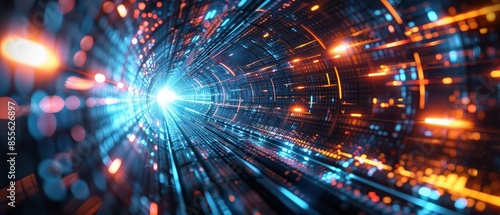 © Seksan, Fototapeta premium Abstract high-tech tunnel with colorful light streaks, visualizing the speed and flow of digital data