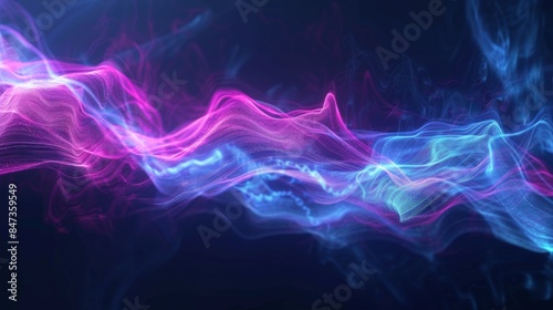 © wellart, Fototapeta premium Abstract holographic iridescent neon curved wave in motion dark background 3d render. Gradient design element for banners, backgrounds