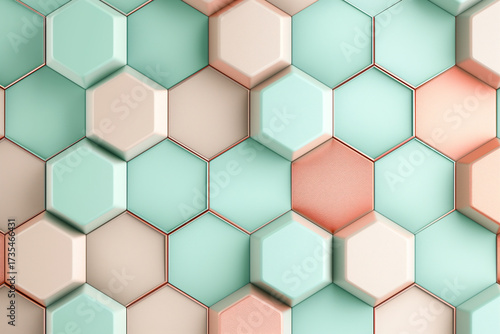Naklejka premium Abstract honeycomb pattern in pastel mint and beige with metallic rose accents