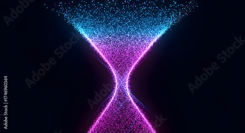 Fototapeta premium Abstract hourglass with glowing particles in blue and purple on black...