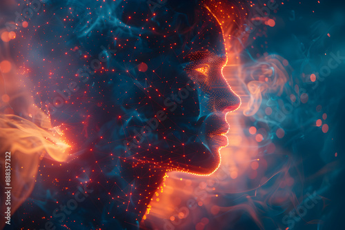 Fototapeta premium Abstract human silhouette with interconnected lines and dots in red, blue,...