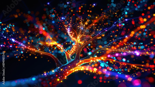 © M, Naklejka premium Abstract illuminated tree with colorful lights and glowing particles on a dark background, creating a magical atmosphere