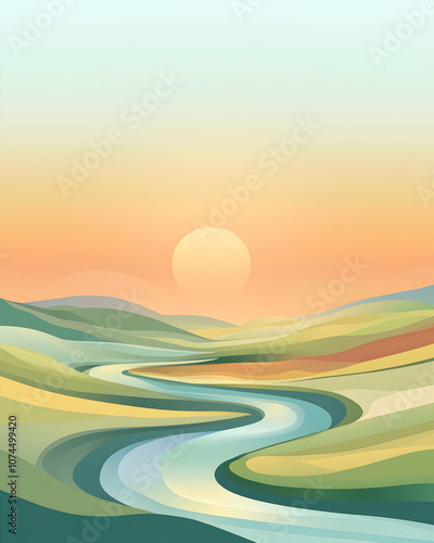 Obraz premium Abstract illustration of a winding river flowing through a valley at sunset.
