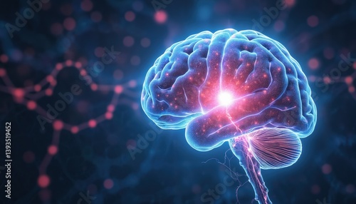 © Viktor, Fototapeta premium Abstract illustration of human brain with glowing neural network electric activity. Represents neuroscience, neurological conditions, artificial intelligence, cognition research, mental health tech,