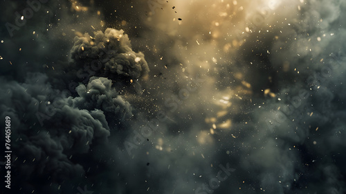 Fototapeta premium Abstract illustration of smoke clouds, fire sparks, stones fragments, flying up embers, burning cinder from explosion or natural disaster. Military banner with copy space. Concept for war games, ads