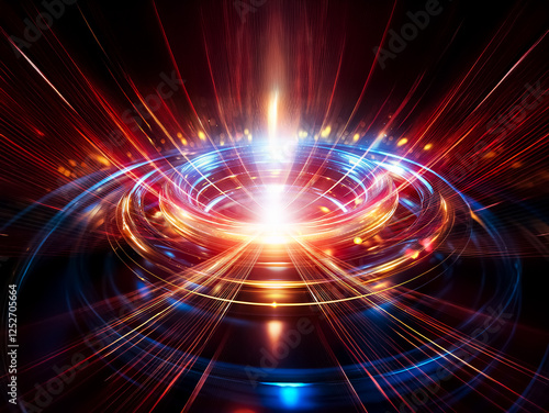 © YiuCheung, Obraz premium Abstract image of a bright, central light source emitting vibrant red, orange, and blue rays and circular patterns, suggesting energy and motion.