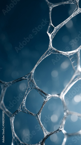 © PhotoArtHub, Fototapeta premium Abstract image of a silver network structure on a blue background, suggesting connection, technology, or molecular bonds