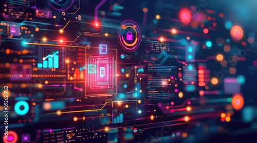 © Wattana, Obraz premium Abstract image of marketing technology tools and software interfaces with digital icons and data flows