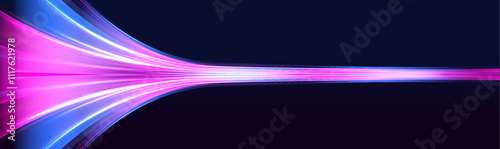 © Mirotvoric, Fototapeta premium Abstract image of speed motion on the road. Dark blue abstract background with ultraviolet neon glow, blurry light lines, waves. Glittering light trails and fire flare traces.