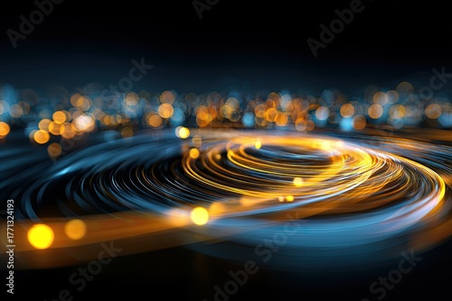 © Sukses, Obraz premium Abstract image of swirling light trails and bokeh lights on a dark background