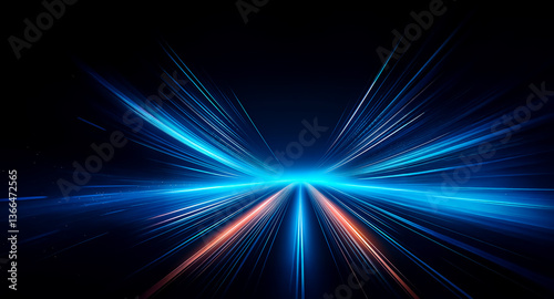 © joeycheung, Obraz premium Abstract image with blue and orange light streaks radiating from a central point on a dark backdrop, creating a dynamic and futuristic effect.