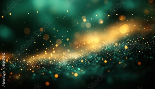 © smalltinykid, Fototapeta premium Abstract Impressionist Glowing Green Bokeh Lights on Dark Teal Background Ethereal Art