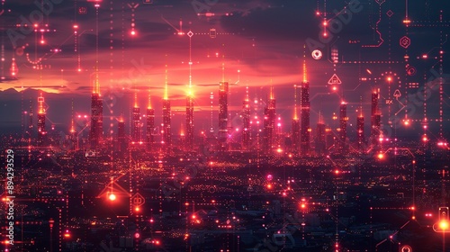 Fototapeta premium Abstract industrial landscape with glowing tech symbols and holographic elements showcasing advancements in technology and science. , Minimalism,