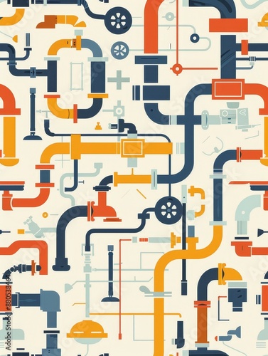 Fototapeta premium Abstract Industrial Seamless Pattern - An abstract seamless pattern with colorful pipes, industrial elements, and a retro style. - An abstract seamless pattern with colorful pipes, industrial elements