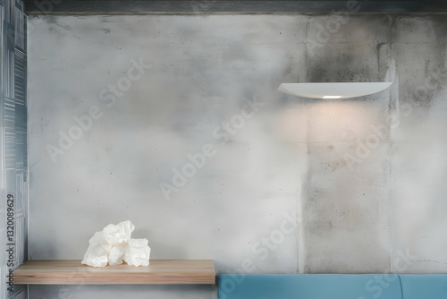 © Siasart Studio, Fototapeta premium Abstract Interior Design: A White Wall with a Modern Wall Lamp, a Wooden Shelf with a White Sculpture, and a Teal Sofa