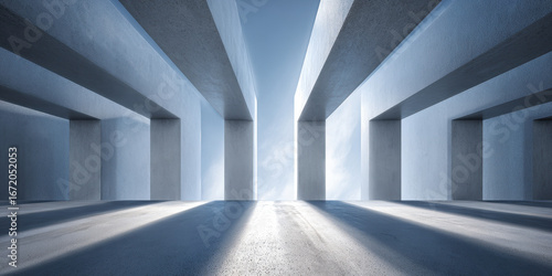 © xartproduction, Obraz premium Abstract Interior Space with Vertical Beams and Striking Sunlight Passage