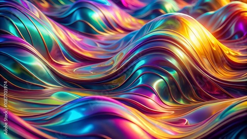 Obraz premium Abstract Iridescent Wave Composition 3D Render, Colorful Liquid Metal Texture, Digital Art, Rainbow Hues Digital art, 3D rendering