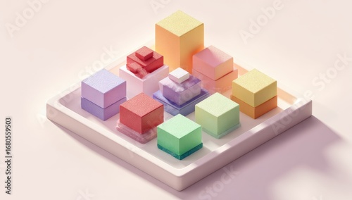 Obraz premium Abstract isometric composition of colorful, stacked cubes in a tray