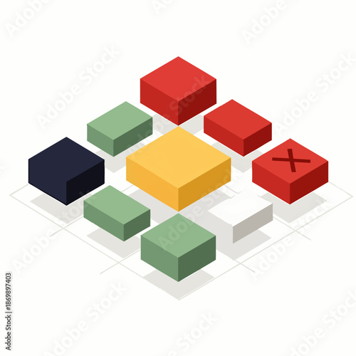 © Yudho, Obraz premium Abstract isometric 3D blocks arranged on a grid, symbolizing data structure, problem-solving, and system architecture with a highlighted error
