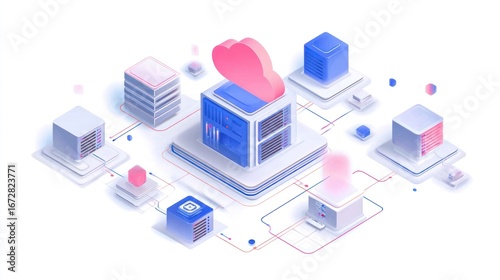 © Riza, Fototapeta premium Abstract isometric network of servers and cloud