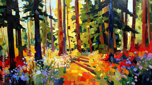 © Valenty, Obraz premium Abstract landscape oil painting depicts a sunlit forest path
