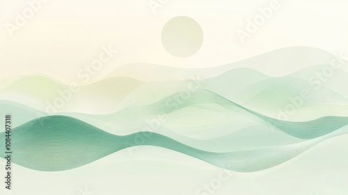 © Katty, Obraz premium Abstract landscape with flowing green waves and sun, minimalistic style
