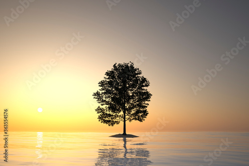Fototapeta premium abstract landscape with tree island in the sea in front of sky and sun - 3D Illustration