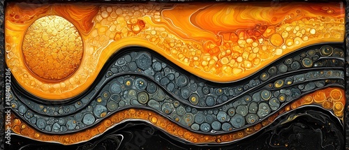 © Akun, Obraz premium Abstract layered artwork featuring flowing, undulating forms in shades of orange, gold, gray, and black. Circular elements are embedded within the layers, creating a textured effect