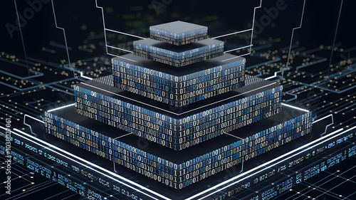 Fototapeta premium Abstract layers of binary code forming a pyramid of financial reports, symbolizing structured data-driven growth. ( Business Concept )