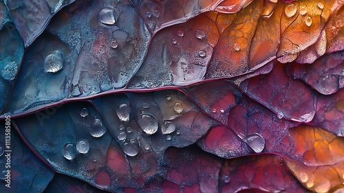 © muhamad, Fototapeta premium Abstract Leaf Texture With Dew Drops And Vibrant Colors