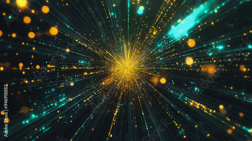 © Teeraphon, Naklejka premium Abstract light explosion and network points, dot, earth's surface, digital background Innovation network points Earth's surface wave background digital wave information technology background
