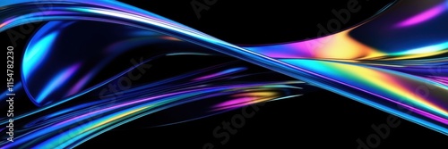 Naklejka premium Abstract light trails, vibrant neon colors, glossy curved surfaces, dynamic motion blur, futuristic technology aesthetic, sleek metallic reflections, high contrast, black background, ultrawide panoram