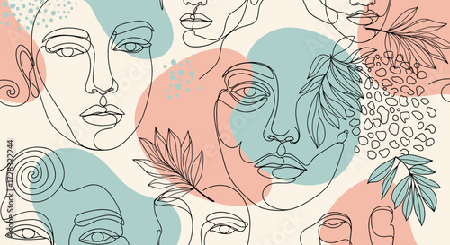 © Masud, Fototapeta premium Abstract line art faces with organic shapes and botanical elements.