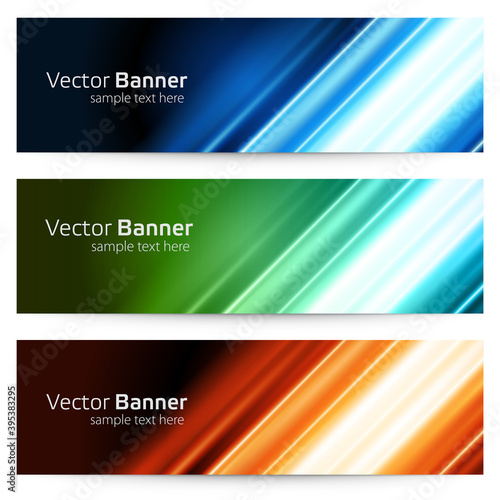 © Виктория Суханова, Fototapeta premium Abstract linear 3d banner from geometric stripes vector template. Ribbed blue lines with bright flashes of light in center.
