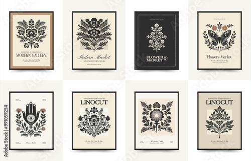 © KozyPlace, Fototapeta premium Abstract linocut floral posters template. Modern trendy minimal style. Black and white colors. Magic, mystical. Hand drawn design for wallpaper, wall decor, print, postcard, cover, template, banner.