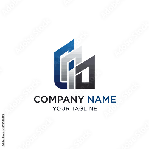 © mbak, Obraz premium Abstract logo design featuring three geometric building-like shapes in blue, silver, and black.