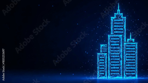 Fototapeta premium Abstract low-poly digital cityscape formed by interconnected lines and glowing blue nodes, symbolizing smart city development, innovation, and future architecture.