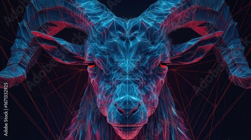 © wikkie, Naklejka premium Abstract low poly goat head illustration with vibrant blue and red colors on dark background