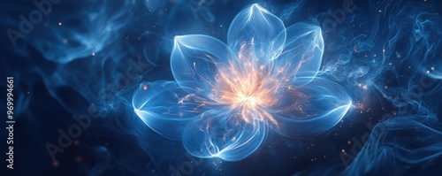 © Georgii, Obraz premium Abstract luminous flower with glowing petals on a dark blue gradient background