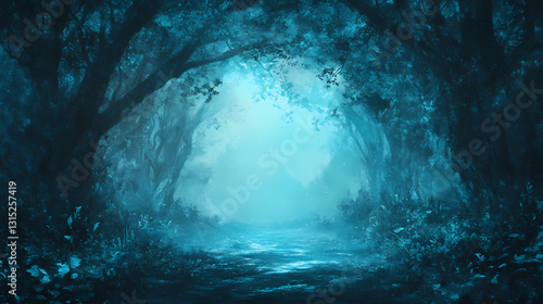 © Thiago, Fototapeta premium Abstract magical light blue background resembling a mystical portal, magic, abstract, light blue, background, mystical. Mystical - Forest. Illustration